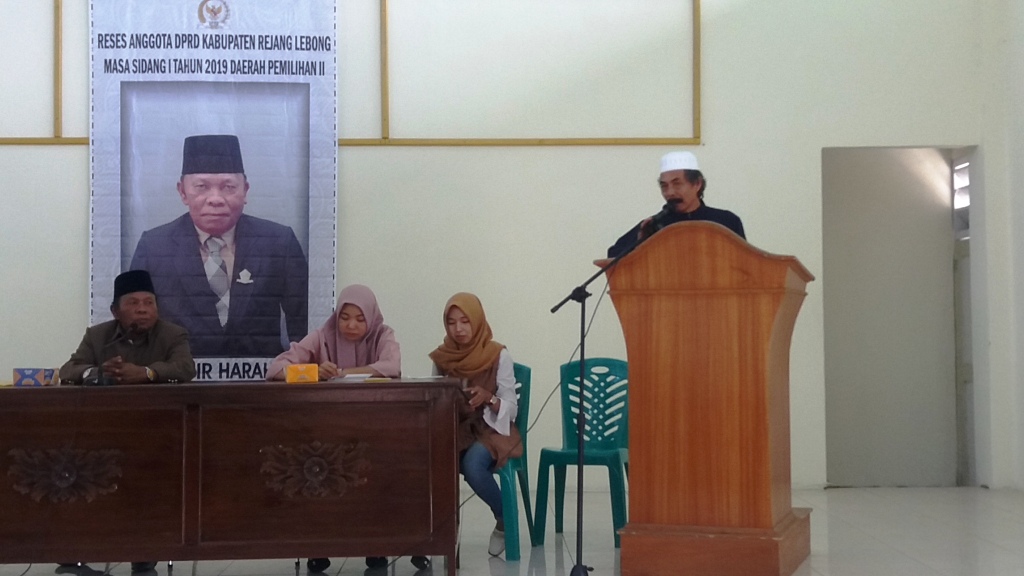 Flamboyannews.com – Rejang Lebong, Salah seorang Anggota Dewan Perwakilan Rakyat Daerah (DPRD) Kabupaten Rejang Lebong, A.A.H Kadir Harahap Menggelar Reses Masa Sidang Pertama Daerah Pilihan (DAPIL) II Di Gedung Islamic Center pada Jumat (15/2/2019) didampingi oleh Hevin Elkarido, SE, Wulan Lestari dan Ade Cintya. Reses ini dihadiri segenap elemen masyarakat Dapil II. Reses bertujuan untuk menyaring aspirasi masyarakat tidak hanya sekedar lisan dalam ucapan tetapi penuntasan masalah-masalah yang dialami secara nyata dalam pelaksanaannya.